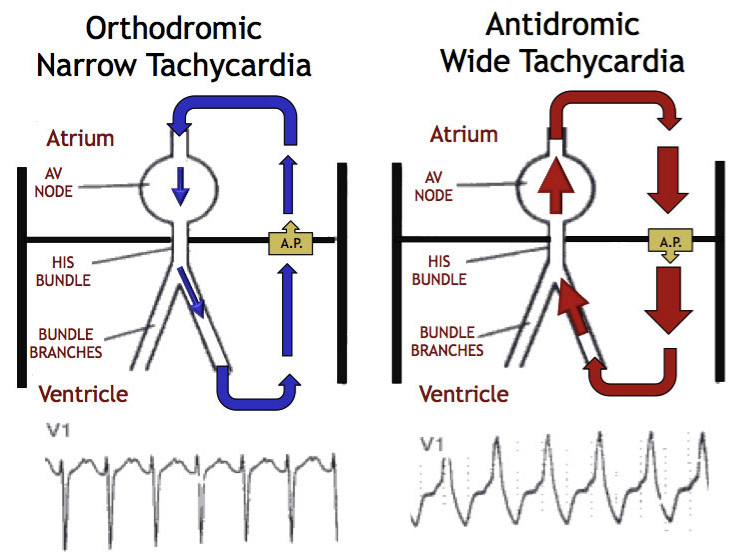 Figure 1. Diagrams of orthodromic and antidromic electrical pathways and associated ECG rhythms. Available at: https://umem.org/files/uploads/content/MattuECG%20Tumblr/OrthoAnti.jpg. Accessed August 4, 2014.